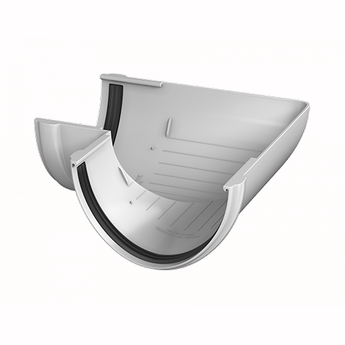Угол желоба предназначен для соединения желобов на карнизах, которые лежат в одной плоскости, но расположены перпендикулярно относительно друг друга.